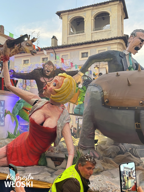 Przede wszystkim muszę wspomnieć o postaci Re Carnevale – Króla Karnawału, któremu wręczane są klucze do miasta w Tłusty Czwartek, Giovedì Grasso, a który następnie “umiera” dzień przed Środą Popielcową, we włoski Tłusty Wtorek, Martedì Grasso. W tym ostatnim dniu postać wykonana z masy papierowej jest przyczepiana do balona napełnianego ciepłym powietrzem i wznoszona ku niebu. Niestety nie mam własnych zdjęć z tego wydarzenia, ponieważ miałam lot powrotny do Polski w poniedziałek.